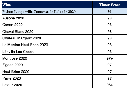 99pts Pichon Lalande 2020 - #3 in Vinous' Top 100 wines of 2024
